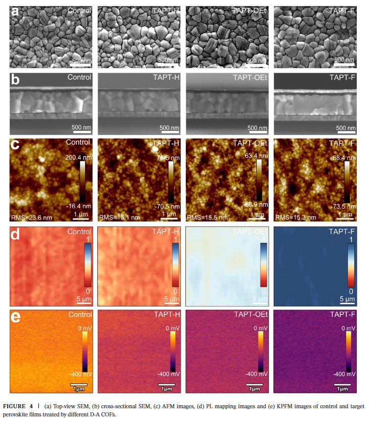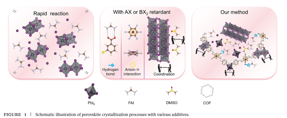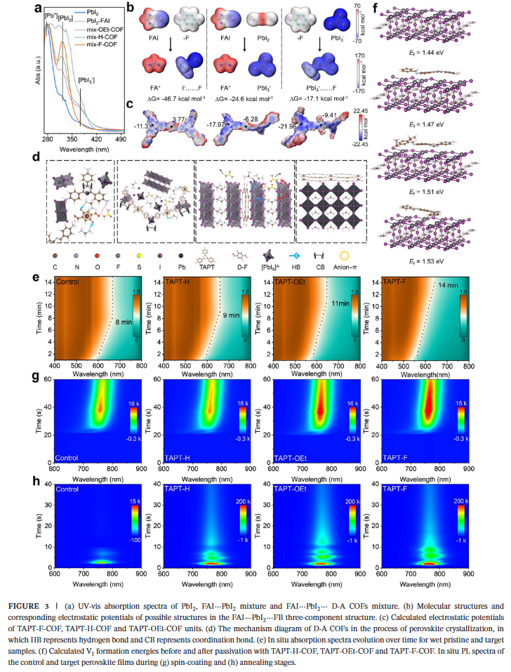 - 首次提出通过调控COF非骨架基团实现“全组分离域结晶”策略,-F基团诱导的局部电荷不对称分布可同时与PbI₂(配位)、FA⁺(氢键)和I⁻(阴离子-π)相互作用,显著延缓结晶过程并提升薄膜质量。