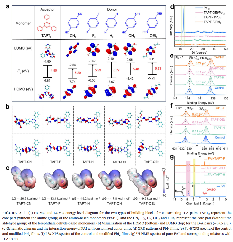 本文东南大学李崇文、山东科技大学薛庆忠、段加龙和唐群委等人报道了一种通过定制共价有机框架非骨架基团(如-F、-H、-OC₂H₅等)来延缓钙钛矿结晶并钝化缺陷的新策略。基于给体-受体相互作用强度对电荷转移特性的影响,理论与实验结果表明,与给电子基团相比,吸电子-F原子诱导局部不对称电子分布,在受体单元形成负性Lewis碱中心、给体单元形成正性π-酸性中心、侧链形成氢键中心,分别与PbI₂、游离I⁻离子和有机阳离子(甲脒,FA⁺)进行离散相互作用。