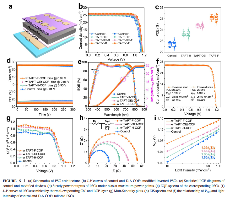 - 氟功能化COF实现多活性位点协同钝化,有效降低缺陷态密度,提升载流子寿命,最终实现倒置PSC效率达26.02%(采用C60/BCP传输层)。