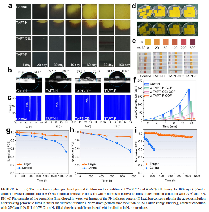 因此,氟功能化COFs实现了微空间尺度上的全组分离域结晶与缺陷钝化,将倒置结构钙钛矿电池效率提升至26.02%,并在75°C老化1000小时、10%相对湿度下2000小时以及连续光照1100小时后表现出显著提升的稳定性。