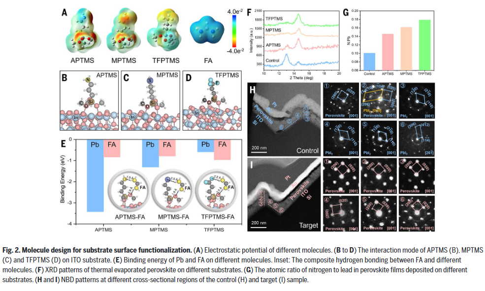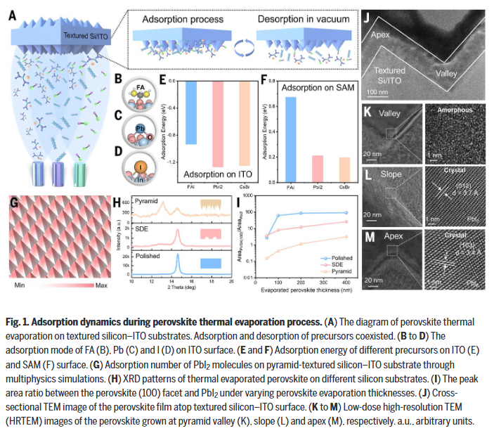 1. 提出“吸附均衡”策略解决工业化纹理硅兼容难题:针对气相沉积中FA⁺吸附弱、导致薄膜非化学计量比与相杂质的问题,设计了具有三甲氧基硅烷锚定基团与富电子氟原子的双功能分子TFPTMS,显著增强有机组分在微米级金字塔表面的吸附能力,实现高质量钙钛矿薄膜的均匀生长。