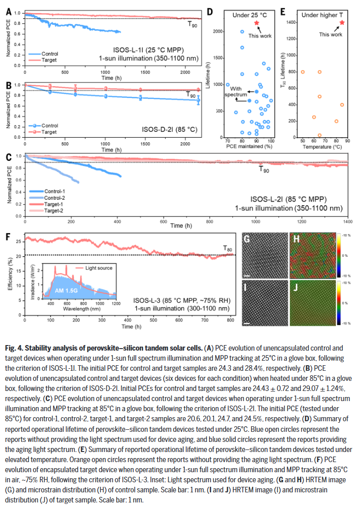 基于该策略制备的钙钛矿-硅叠层太阳能电池在1 cm²孔径面积上实现了31.3%的光电转换效率,并在85°C、1太阳光照条件下连续运行1400小时后仍保持90%的初始性能,展现出优异的操作稳定性。