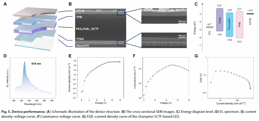 针对深蓝色钙钛矿发光二极管(LED)中因宽带隙钙钛矿结构缺陷导致的载流子传输受损与非辐射复合严重等关键挑战,清华大学、南京工业大学、香港理工大学等多家科研团队创新性提出原位生长高质量单晶薄膜(SCTF)与双层协同钝化界面策略。该研究通过空间限制生长法在空气中原位制备出大面积、高取向、原子级平滑的PEA₂PbBr₄钙钛矿单晶薄膜,并结合理论计算指导缺陷调控,实现了深蓝光高效辐射。在器件工程方面,通过优化空穴传输层与覆盖基板界面,采用两段式热退火结晶工艺,显著提升了薄膜质量与发光效率。最终,基于该单晶薄膜的深蓝钙钛矿LED实现了中心波长419 nm、最大亮度179 cd/m²的深蓝电致发光,其外量子效率达0.19%,是目前基于二维钙钛矿的深蓝器件中亮度最高的成果之一。该研究以"Deep-blue light-emitting diodes based on perovskite single-crystal thin films"为题发表在顶级期刊《Science Advances》上。