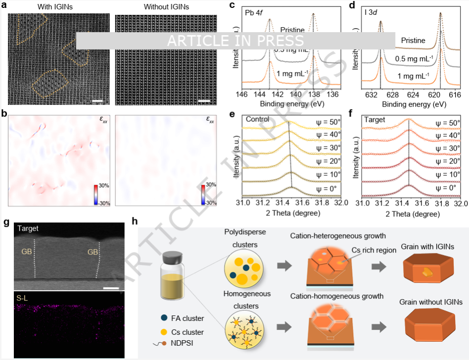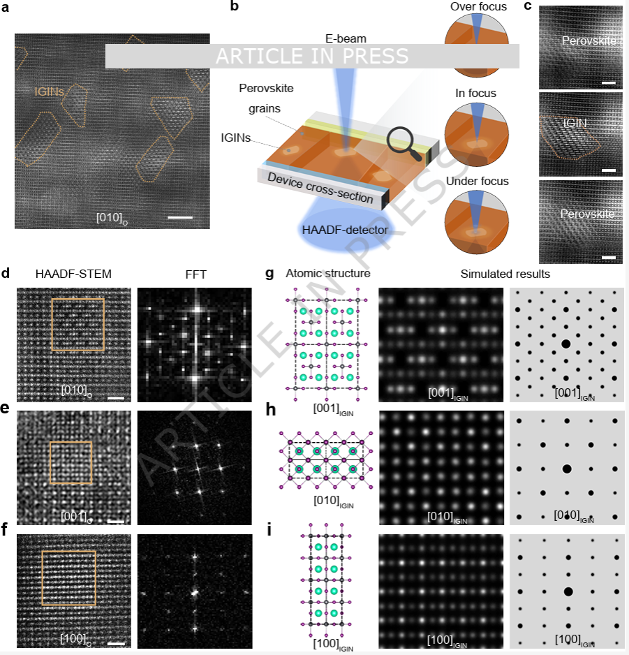 本研究香港理工大学蔡嵩骅和香港科技大学周圆圆等人利用低剂量扫描透射电子显微镜,首次明确证实了在名义上制备的掺铯混合阳离子钙钛矿薄膜中存在一种此前未知的亚稳态正交晶系非钙钛矿相——晶内杂质纳米团簇(IGINs),其具有平行链状结构。第一性原理计算与准原位观测表明,这些IGINs会对钙钛矿的光电性能和化学稳定性产生不利影响。基于此,我们在溶液加工过程中引入内盐(NDPS),有效降低了IGINs密度,提升了器件性能。
