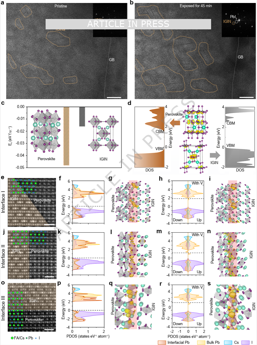 - 阐明杂质形成机制及其对性能的双重负面影响:IGINs由阳离子偏析形成,不仅带隙宽、阻碍载流子传输,还在环境应力下易分解为PbI₂,成为钙钛矿降解的“内因”。