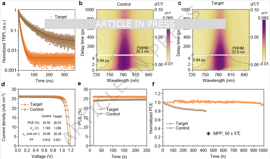 - 提出化学消除策略并实现高效稳定器件:通过引入NDPS内盐添加剂,有效抑制阳离子偏析、消除IGINs,将钙钛矿太阳能电池效率提升至26.03%,T₉₅稳定性超过1000小时。