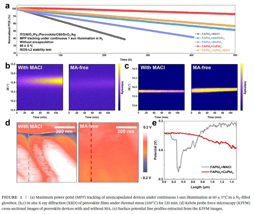 - 本征稳定组分设计:系统评估不同阳离子、卤素对稳定性的影响,明确无MA的Cs-FA钙钛矿在持续光照和热应力下具有更优的本征稳定性,奠定模块稳定运行的材料基础。