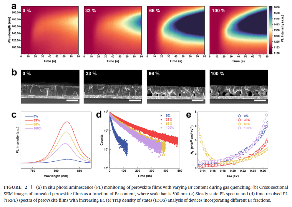 - 刮涂友好结晶调控:通过Br部分取代I,调控CsPbX₃相变诱导剂,优化前驱体溶解性、成核动力学与α相稳定性,实现空气刮涂制备高质量、大面积钙钛矿薄膜。