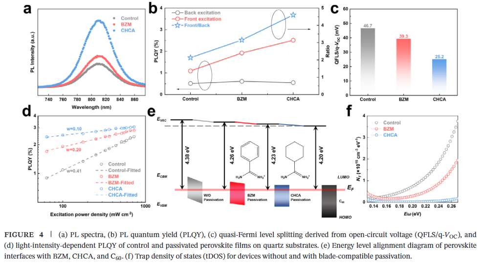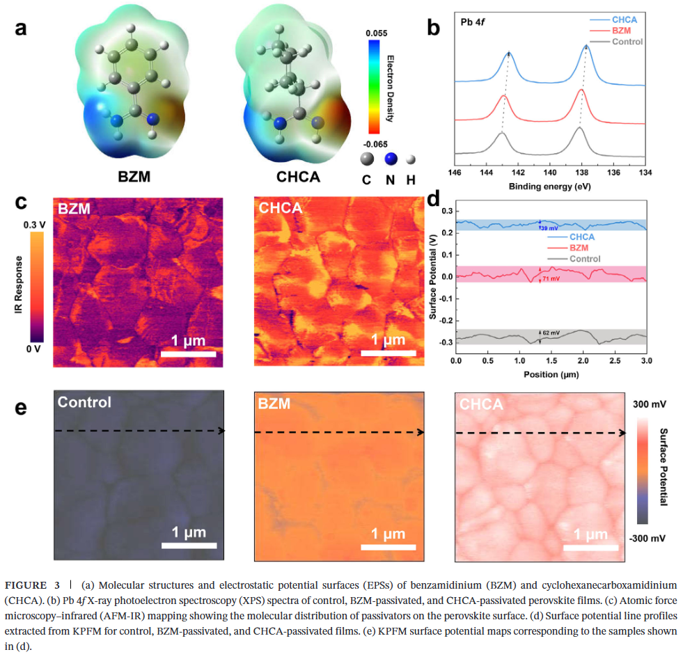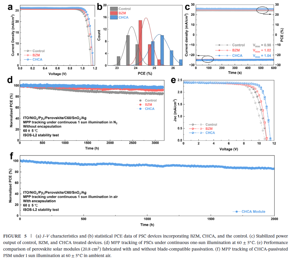 - 刮涂兼容钝化分子设计:针对刮涂过程中钝化剂分布不均的问题,设计具有柔性环己基结构的CHCA分子,实现均匀表面覆盖与界面能级匹配,显著抑制缺陷态,提升器件效率与长期稳定性。