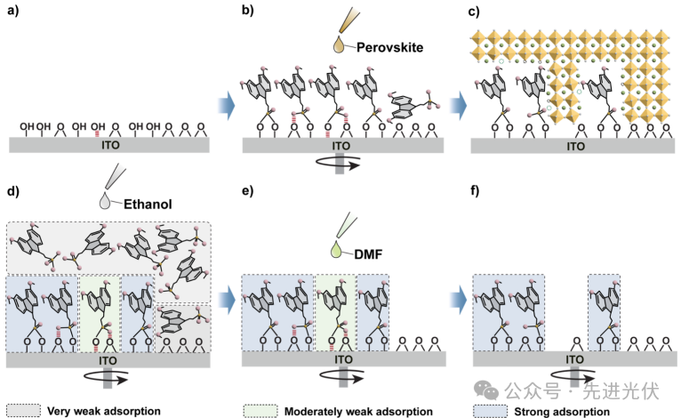 Figure 1通过示意图生动展示了钙钛矿沉积过程中SAM结构的动态演变及选择性溶剂清洗策略的定量分析原理。图中首先描绘了等离子处理后的ITO表面存在羟基化与非羟基化区域的异质结构,其中强吸附位点以实线标出而弱吸附位点以虚线标示;随后SAM分子在ITO表面形成时其吸附模式分布受基底化学性质调控,而钙钛矿前驱体溶液中的极性溶剂会洗脱弱结合分子导致SAM覆盖度下降;最后通过乙醇与DMF的阶梯式清洗实验,研究人员能够区分并量化不同结合强度的SAM分子——乙醇可去除次级层及第一层中通过咔唑基团弱吸附的分子,而DMF还能进一步清除通过氢键结合的分子,最终仅保留共价键合的稳定SAM分子,这种顺序清洗法为重构SAM吸附模式分布提供了关键实验依据。