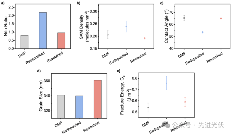 Figure 4展示了再沉积策略对增强SAM稳定性的多重效益及其界面机制。XPS显示再沉积后氮铟比从0.78升至2.41,但CV面密度仅从0.206增至0.239分子/nm²,说明新增分子主要形成次级层;二次DMF清洗后氮铟比较基线高13-21%,而CV面密度不变,证实次级层分子通过π-π堆积等相互作用获得稳定性。接触角在再沉积时降至53.7°(磷酰酸基团暴露),重洗后恢复至65.1°,说明稳定分子保持直立取向;钙钛矿晶粒在再沉积后保持340 nm而重洗后增至361 nm,结合界面断裂能从0.54 J/m²提升至0.76 J/m²的数据,表明再沉积策略通过增强分子间作用力实现了界面稳定性的跨越式提升。