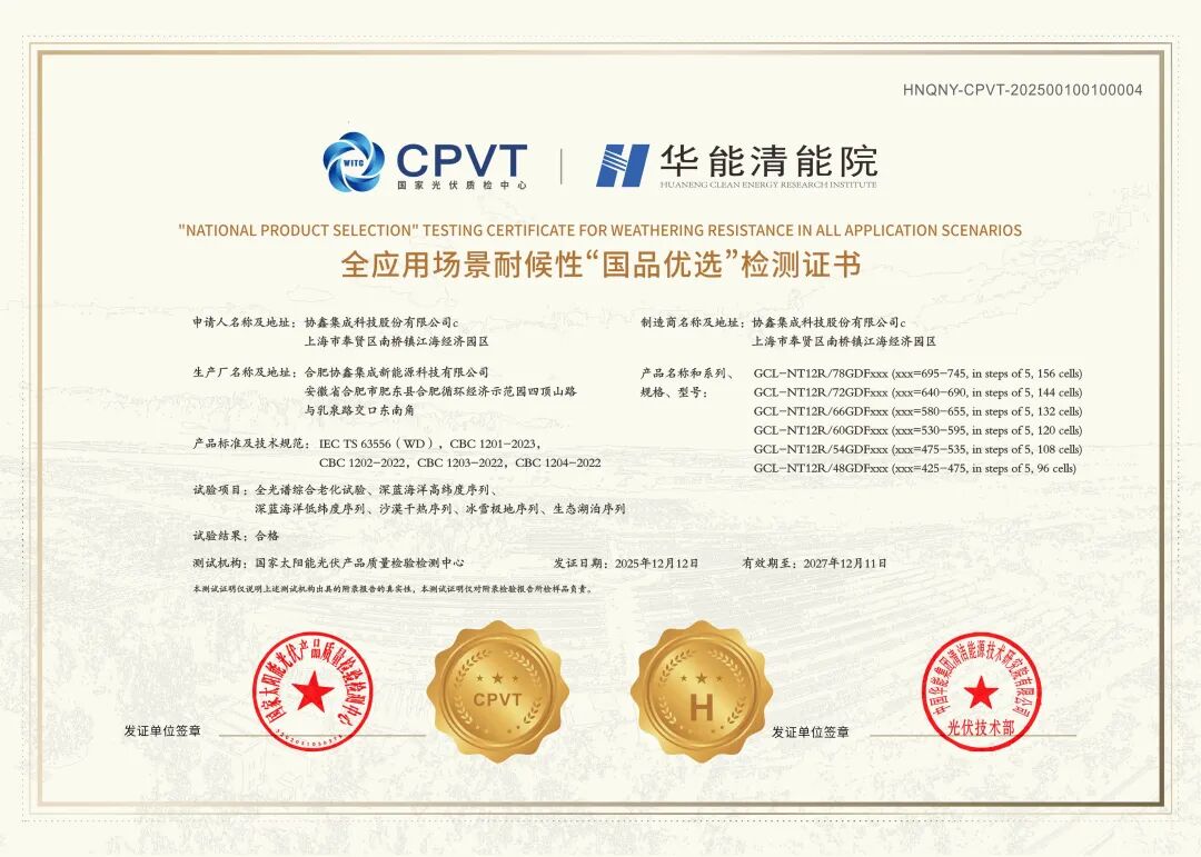 就在近日,协鑫集成获得了国家光伏质检中心(CPVT)和华能清能院颁发的《全应用场景耐候性“国品优选”检测证书》,其光伏组件产品通过了包括全光谱综合老化试验、深蓝海洋高纬度序列、深蓝海洋低纬度序列、沙漠干热序列、冰雪极地序列、生态湖泊序列在内的多场景认证,迈出了构筑产品差异化竞争优势的坚实一步。值得一提的是,协鑫集成是业内为数不多实现全场景、多维度认证的光伏企业。