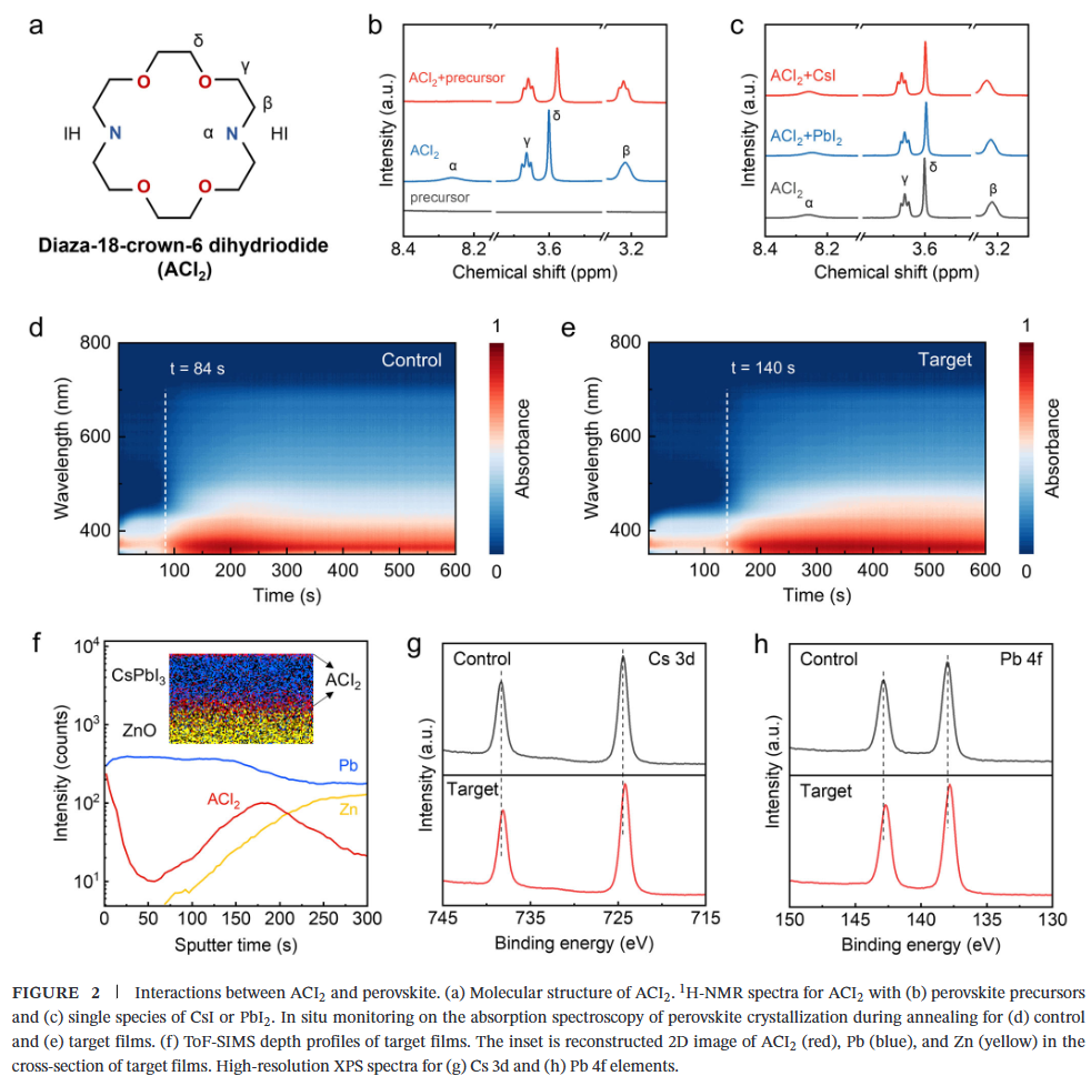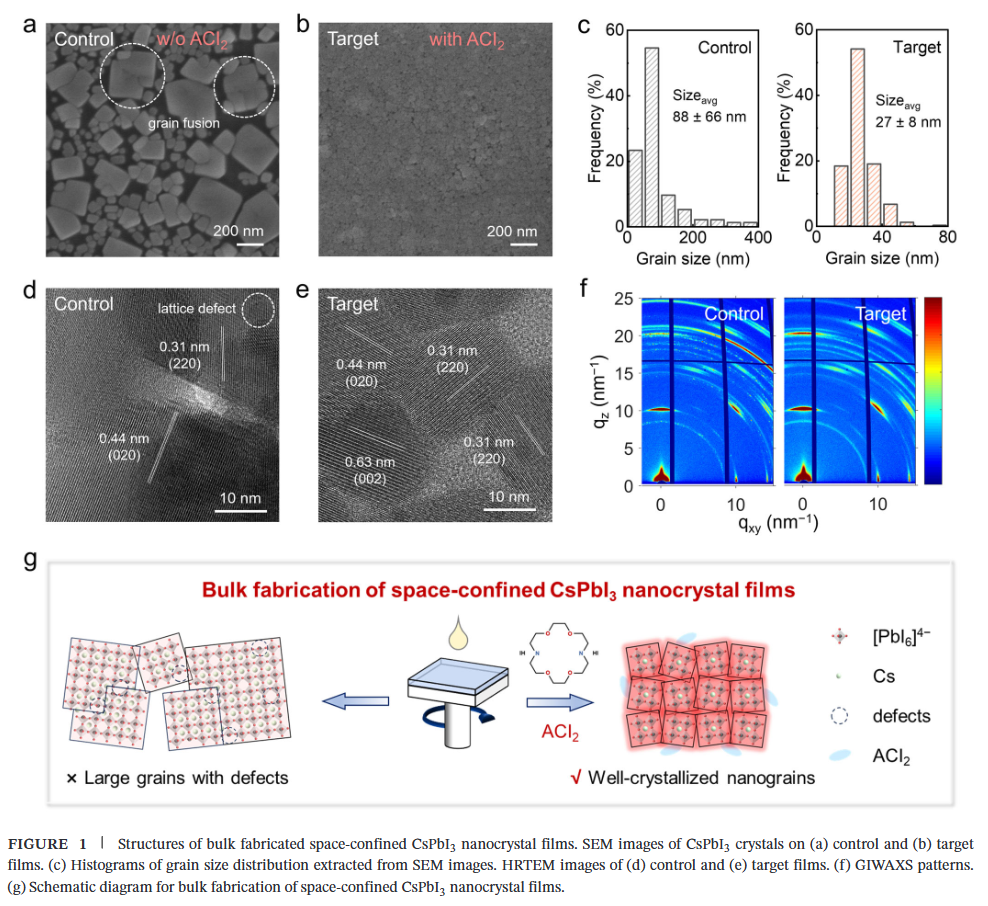 - 提出“结晶调控‑缺陷钝化”双功能添加剂策略:利用二氮杂‑冠醚衍生物(ACl₂)同时促进成核、抑制晶粒过度生长,并作为路易斯碱配体钝化界面缺陷,实现了高质量空间限域CsPbI₃纳米晶薄膜的大规模制备。