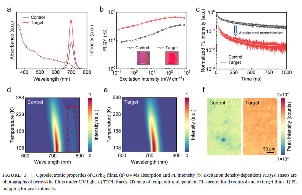发射波长在690–710 nm的深红光发光二极管(LED)在光学、农业与生物医学等领域具有重要应用价值。作为深红光发射体的主要候选材料,全无机CsPbI₃薄膜通常因晶粒融合且缺陷态多而导致深红光钙钛矿LED性能不佳。