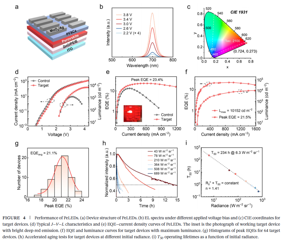 - 实现深红光钙钛矿LED性能突破:器件EQE达23.4%,亮度超过10000 cd·m⁻²,且在900 mA·cm⁻²高电流下仍保持>20%的EQE,综合性能处于深红光LED领域领先水平。