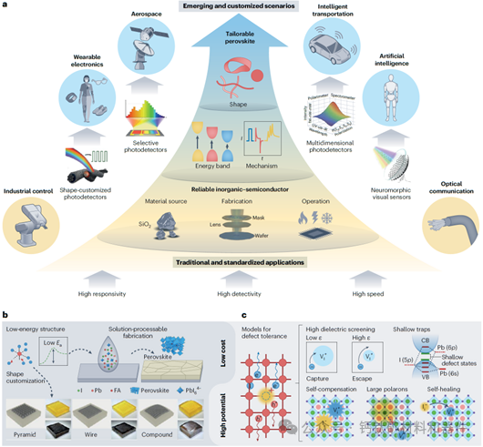 图a 传统应用(黄色背景)对可靠性要求严苛,因此由无机半导体主导;新兴应用(蓝色背景)则在性能之外更强调多样化功能与特性,使可按需调控的钙钛矿材料成为理想选择;