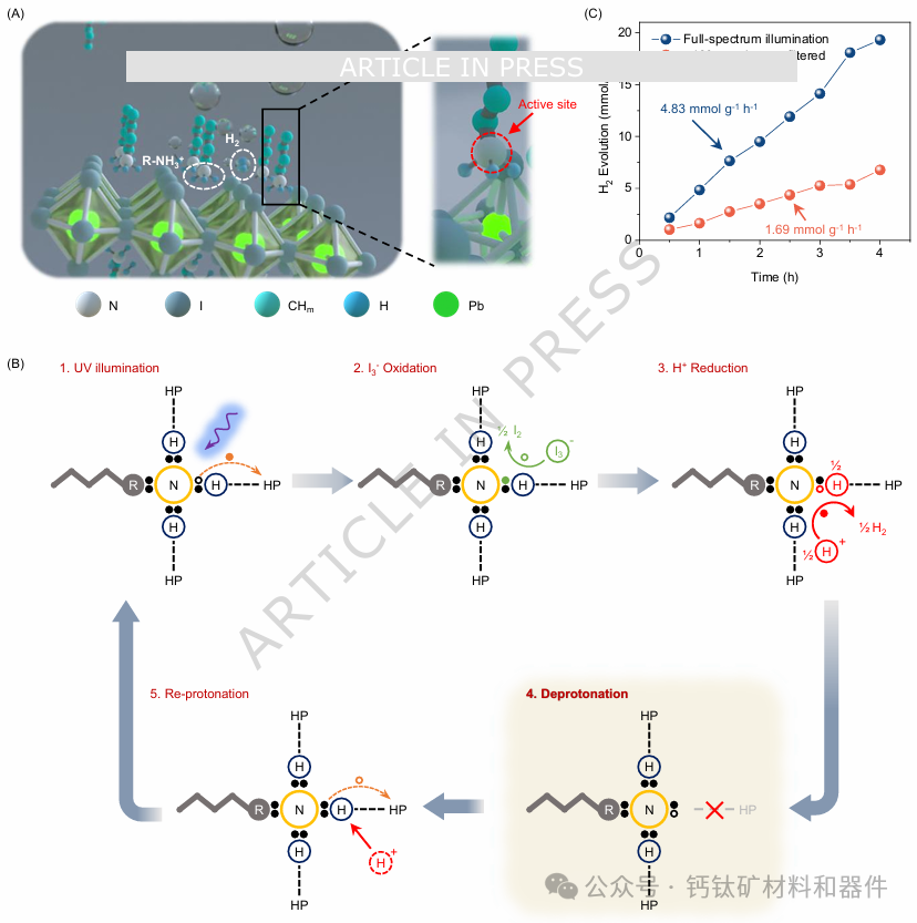 紫色光/紫外光线诱导的胺基去质子化。(A) 设计的光反应示意图,其中铵配体的去质子化产生H2。铵配体的氮原子是该过程的活性位点。(B) 紫光/紫外光触发的光反应循环示意图。空心圆表示空穴,实心圆表示电子,彩色空穴/电子表示参与相应动力学的电荷载体。(C) 在全光谱照射和紫光/紫外光滤光照射(<420 nm 光子被滤除)下,二维的产氢活性。