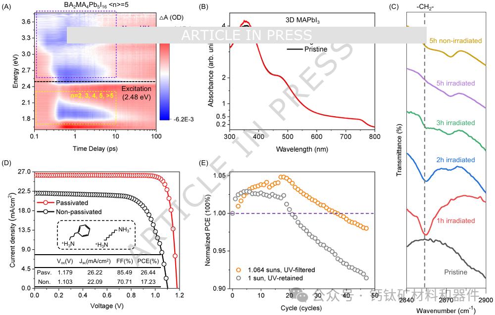 紫色光/紫外光线诱导高性能太阳能电池的钝化失效。(A) 多相 BA2MA4Pb5I16薄膜的伪彩超快瞬态吸收光谱,标称 <n> 值为 5。激发能量设置为 2.48 eV(500 nm, 1 kHz, 100 fs)。(B) 3D 高性能薄膜在使用铵配体进行表面处理前后的对比吸收光谱。(C) 铵配体钝化的 3D 高性能薄膜在紫外光照射(365 nm @~25 mW/cm2, 5 小时)和暗环境下的对比 FTIR 光谱。(D) 钝化和未钝化太阳能电池的 I-V 特性及其器件性能概览。插图:用于钝化的铵配体分子结构。左侧为 PPA,右侧为辛二胺-1,8-二铵盐。(E) 铵配体钝化太阳能电池在含紫色/紫外光和过滤紫色/紫外光的太阳光照下的 PCE 演变对比。太阳能电池进行了光暗交替测试,每个周期为 7 秒照明和 3 秒黑暗。