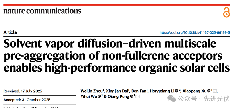 Zhou, W., Dai, X., Fan, B. et al. Solvent vapor diffusion-driven multiscale pre-aggregation of non-fullerene acceptors enables high-performance organic solar cells. Nat. Commun. 16, 11188 (2025).