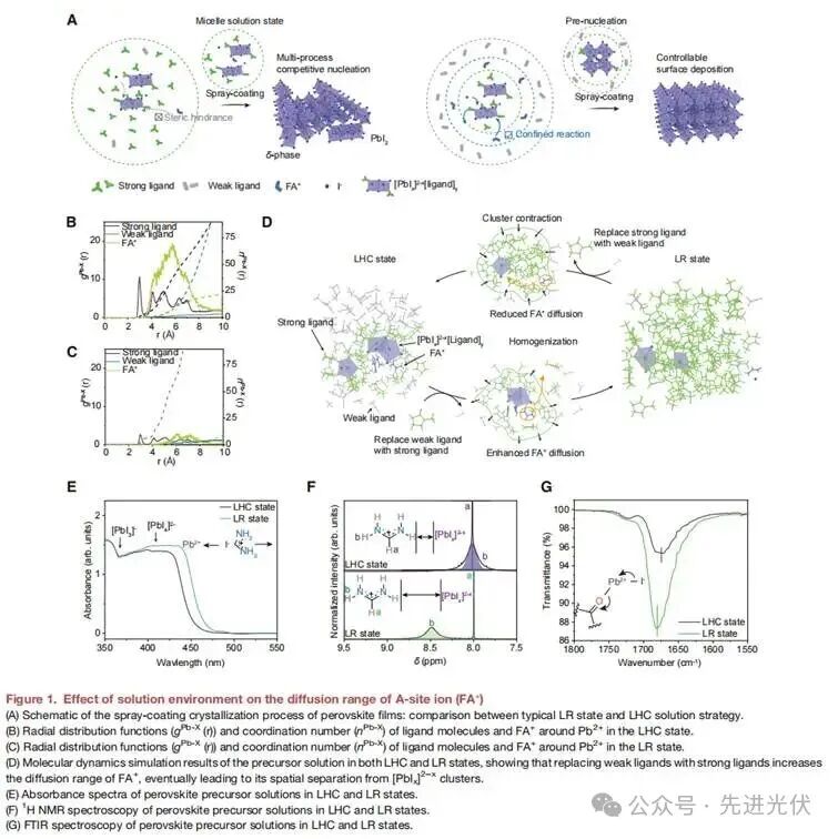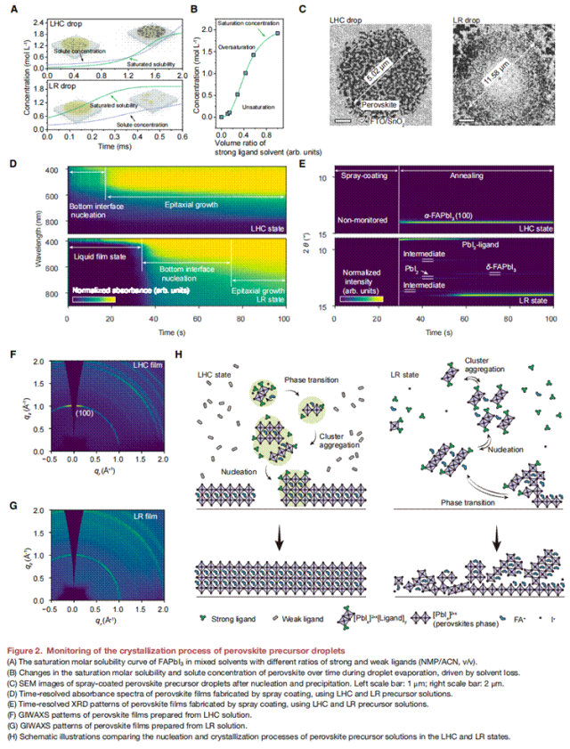 ➤ 局部溶剂簇限制结晶:采用强弱配体溶剂组合构建 LHC 前驱体限制A位离子扩散,使其与铅碘团簇近距离接触,在喷涂液滴中形成局部高浓度前驱体,促进体相预成核,避免咖啡环效应。