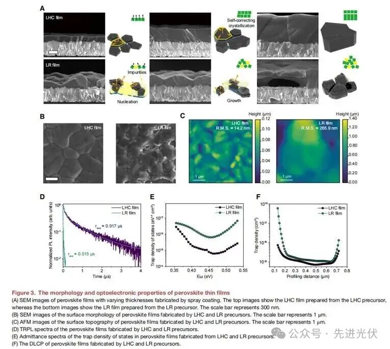 图A的截面 SEM 表明LHC 策略可制备厚度均匀、无孔隙的贯穿晶粒薄膜,且通过自校正结晶机制缓解应力积累;而 LR 薄膜厚度波动大,存在大量杂质和空隙。图B、C 的表面结果证实,LHC薄膜的表面粗糙度(R.M.S. =14.2nm)与旋涂薄膜相当,远低于LR 薄膜的 265.9nm。图D-F的光电性能测试揭示了核心优势:LHC 薄膜的平均荧光寿命(0.917μs)是LR 薄膜(0.015μs)的60 倍,体相缺陷密度低至 10¹⁴-10¹⁵ cm⁻³,且顶部界面缺陷显著减少。这些数据表明,LHC 策略不仅优化了薄膜形貌,更从根本上降低了非辐射复合中心密度,为高效电荷输运提供了结构保障。