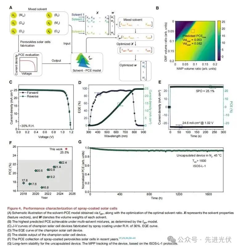 图A、B的机器学习模型创新之处在于,将溶剂分子量、偶极矩等 6 个参数与PCE 关联,预测出 DMF:NMP:ACN=0.053:0.082:0.865 时效率最优。图C-E的核心数据验证了这一预测:冠军器件的 J-V 曲线显示其Voc 1.19V、短路电流 25.2 mA/cm²、FF 0.849,PCE 达 25.5%;EQE积分电流与 J-V 测试高度吻合,稳态输出效率稳定在 25.1%。图F的对比表明,该效率远超近年来报道的喷涂钙钛矿电池(多低于 23%)。图G的稳定性测试显示,未封装器件在氮气中经 1600 小时光照后,PCE仍保持初始值的 90% 以上,证明高结晶质量带来了优异的光稳定性,为其实际应用提供了关键支撑。