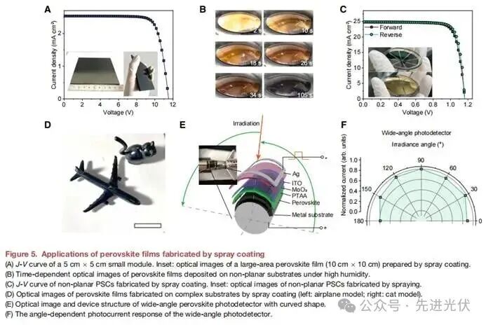 图A表明该技术实现了 10cm×10cm 大面积均匀薄膜制备,5cm×5cm迷你组件的 PCE 达 22.5%,Voc高达11.5V,证明其具备模块扩展能力。图B、C 突破了传统工艺的平面限制,在 78% R.H. 条件下成功在曲面基底上制备器件,PCE 达23.2%,解决了非可展曲面沉积的应力和界面失配难题。图D 展示了在飞机、猫咪等复杂金属模型上的 conformal 沉积,验证了技术的通用性。图E、F的广角光电探测器进一步拓展了应用场景,其响应角度覆盖 180°,表明该喷涂技术可在保留基底原始结构和设计美学的前提下,实现原位光电器件制备,为建筑集成光伏、车载光电等领域开辟了新路径。