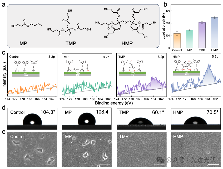 Figure 1系统展示了三种硫醇交联剂(MP、TMP、HMP)的化学结构及其对界面性能的多维度影响。从化学结构来看,MP为单硫醇分子,TMP和HMP分别具有三个和六个硫醇基团,这种多官能团设计为界面交联提供了更多可能;力学测试显示TMP处理的样品断裂载荷从对照组的116.8 N显著提升至205.5 N,而HMP更是达到246.4 N,证明多硫醇分子能有效增强界面结合强度。XPS分析揭示TMP和HMP样品在169 eV(键合硫)和164 eV(游离硫)处出现双峰,表明多硫醇分子既能与NiOx基底形成化学键又保留游离-SH基团用于钙钛矿配位。接触角测试显示TMP处理使界面亲水性大幅改善(从104.3°降至60.1%),SEM图像证实这种润湿性提升能有效减少钙钛矿埋底界面的纳米级孔洞,为高质量晶体生长奠定基础。