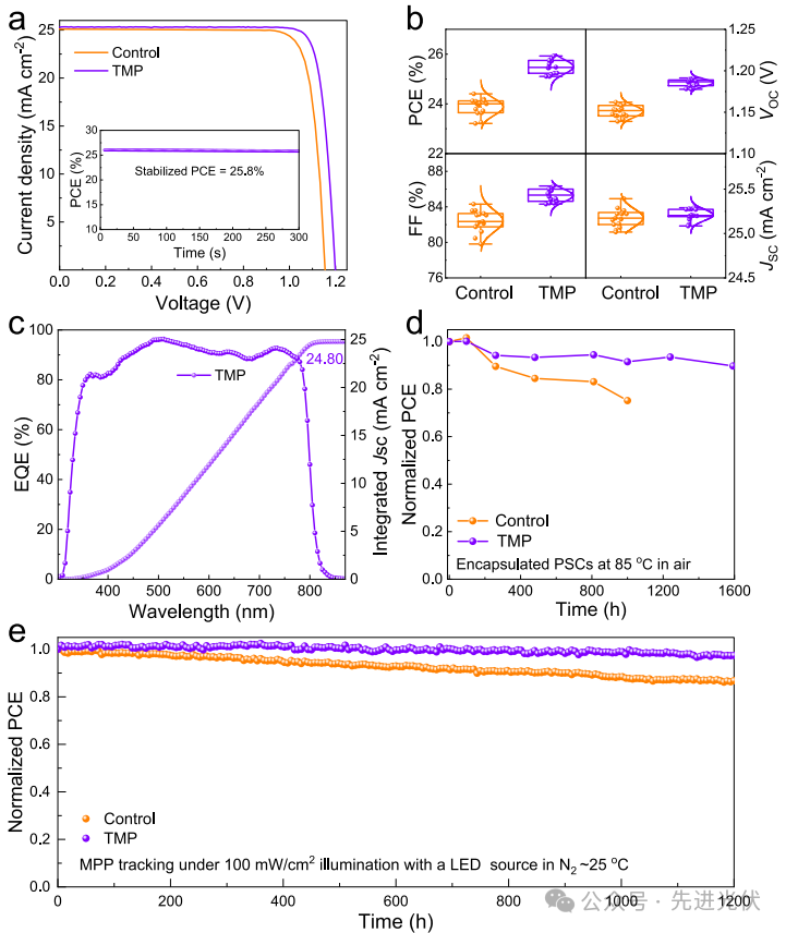 Figure 4 最终将界面优化效果转化为卓越的器件性能与稳定性。冠军TMP器件效率达26.16%(认证效率25.11%),较对照组(24.40%)实现全面提升,其中VOC从1.15 V增至1.20 V,FF从84.30%优化至86.17%。统计箱线图显示TMP器件参数集中度高,证明工艺重现性良好;EQE光谱积分电流与J-V测试值高度吻合。稳定性测试展现突破性成果:在85°C高温老化1600小时后TMP器件仍保持90%初始效率,而对照组仅维持260小时;连续MPP跟踪1200小时后TMP器件效率损失仅3%,远超对照组(15%效率衰减)。这种稳定性飞跃源于TMP构建的"Ni-TMP-Pb"分子桥机制,通过强配位键合与界面应力调控,实现了效率与稳定性的协同提升。