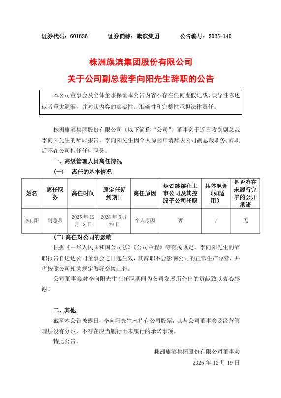 近日,旗滨集团发布公告,株洲旗滨集团股份有限公司(以下简称“公司”)董事会于近日收到副总裁李向阳先生的辞职报告。李向阳先生因个人原因申请辞去公司副总裁职务,辞职后不在公司担任任何职务。