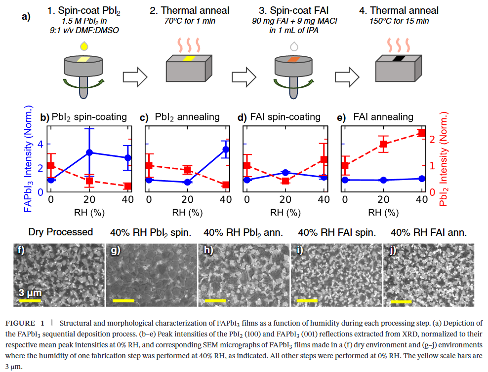 本研究普林斯顿大学Quinn C. Burlingame和Yueh-Lin Loo等人系统探究了在空气和氮气环境下,无反溶剂两步法制备甲脒铅碘(FAPbI₃)过程中每一步沉积与退火步骤对湿度的依赖性。通过旋涂过程中的原位掠入射广角X射线散射(GIWAXS)测量发现,湿度会影响钙钛矿前驱体薄膜中中间相的形成与演变动力学。这些差异以及退火过程中湿度引入的影响,最终会影响钙钛矿薄膜的结构、形貌和组成,但所研究湿度范围内制备的太阳能电池初始性能对湿度相对不敏感。相比之下,采用干法处理的活性层或在湿度环境下进行最终退火的器件表现出最佳稳定性。PbI₂旋涂步骤对环境最为敏感——在40%相对湿度下旋涂会导致针状结构析出,从而显著降低光伏性能与器件稳定性。此外,在空气和氮气中制备的薄膜与电池性能基本一致。