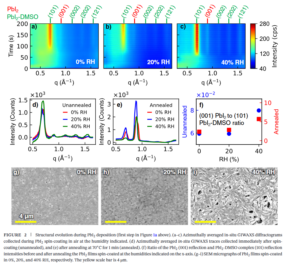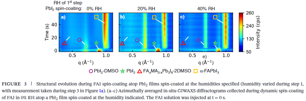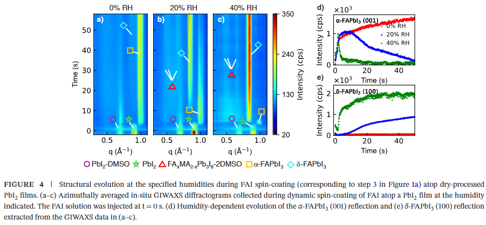 - 原位GIWAXS揭示湿度影响机制:首次系统利用原位GIWAXS观测两步法FAPbI₃制备中各步骤的湿度依赖性,明确揭示了湿度加速PbI₂及其溶剂复合物的析出与结晶,并影响α/δ相转变动力学。