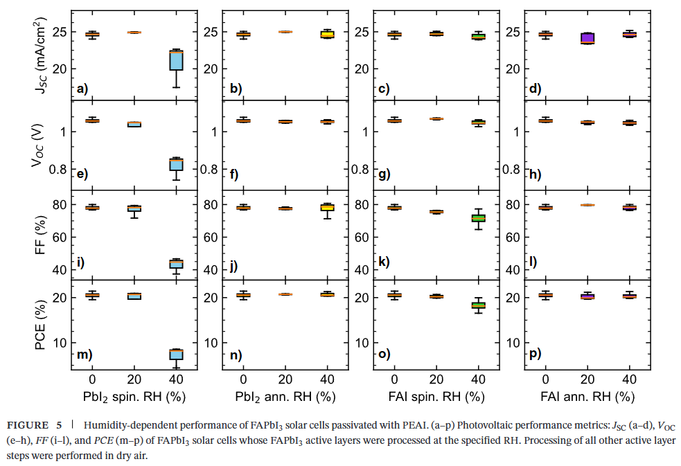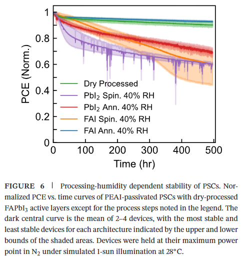 - 性能与稳定性“脱钩”:虽然器件初始效率在宽湿度范围内差异不大,但稳定性对环境条件极为敏感。干法制备或最终退火在湿度下进行的器件表现出显著提升的长期光照稳定性。