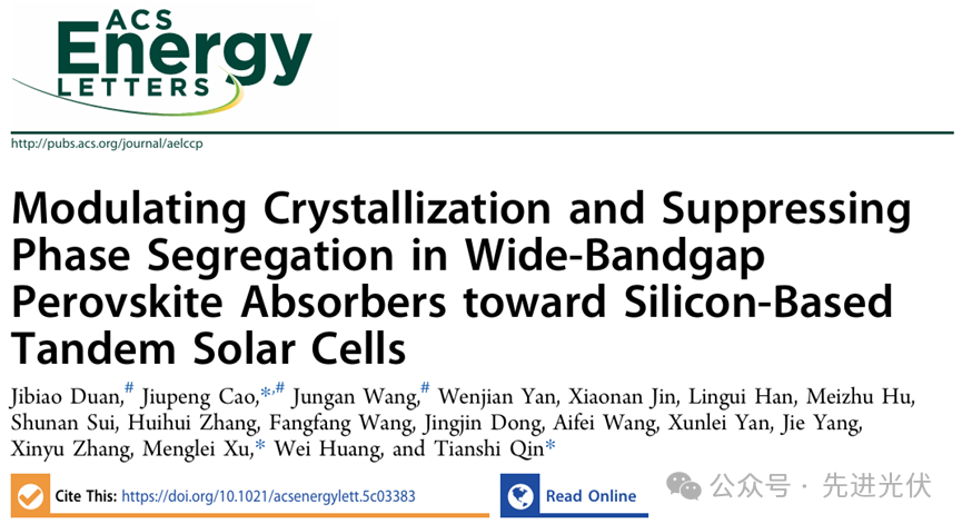 宽带隙钙钛矿太阳电池是叠层光伏器件的关键组成部分。然而宽带隙钙钛矿中较高的溴离子含量容易导致复杂的结晶过程和薄膜质量的降低。光诱导相分离进一步制约了宽带隙电池的长期稳定性。针对此问题,南京工业大学曹久朋&秦天石团队于《ACS Energy Letters》发表题名为“Modulating Crystallization and Suppressing Phase Segregation in Wide-Bandgap Perovskite Absorbers toward Silicon-Based Tandem Solar Cells”的研究成果,通过引入了二维PAPbI4(PAI,4-吡啶甲基碘化铵)钙钛矿以调控宽带隙钙钛矿的结晶过程,PAI与三维钙钛矿组分之间的强相互作用减缓了结晶速率,从而提升了晶体质量并抑制了卤化物离子相分离。该策略具有普适性,显著提升1.67至1.85 eV带隙范围的宽带隙钙钛矿光伏器件的光电压。基于该策略使两端钙钛矿/硅叠层太阳电池实现了32.11%的光电转换效率。