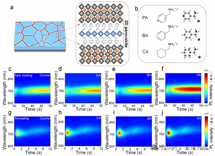 示意图展示2D钙钛矿优先分布于3D钙钛矿晶界处,并通过有机间隔阳离子(PAI、BAI、CAI)与钙钛矿组分的配位作用延缓结晶过程;旋涂过程的原位PL显示PA改性薄膜的荧光强度显著增强,退火过程的原位PL中荧光强度的降低对应钙钛矿薄膜的多形态转变过程,且PA改性样品中PL衰减延时出现,意味着对结晶过程的延缓作用。
