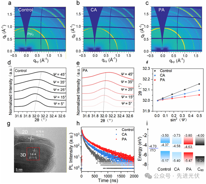 GIWAXS图像显示引入有机间隔阳离子CA或PA后,钙钛矿薄膜中残留PbI2相明显减少,尤其是PA改性后钙钛矿(100)晶面散射环强度增强且取向均匀性提升,GIXRD测试表明对照组存在残余应力,而PA改性策略使应力得到有效释放;TEM图像直接观察到分布于3D钙钛矿晶界处归属于二维PAPbI₄的9.75 Å晶格条纹,进而有效钝化晶界处缺陷;TRPL曲线显示改性薄膜载流子寿命延长,能级示意图显示PA改性钙钛矿层表现出增强的n型特性,从而协同优化了电荷提取与界面传输。