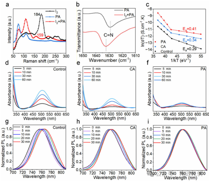 拉曼光谱中PAI与I₂混合后I-I伸缩峰(184 cm⁻¹)消失并出现159 cm⁻¹新峰,FTIR中C=N键蓝移,证实PA中吡啶氮与I₂形成N-I键,捕获游离碘;温度依赖性电导率测试显示PA改性薄膜的离子迁移活化能从0.42 eV提升至0.58 eV,有效抑制离子迁移;甲苯溶液浸泡60分钟提取析出的I2后,吸收光谱显示对照组I₂特征峰(505 nm)强度显著增加,而改性组仅轻微变化;持续光照下的PL对比发现对照组发生红移展宽,PA改性组保持稳定,表明引入的PA通过化学键合作用有效阻碍了卤化物相分离路径。
