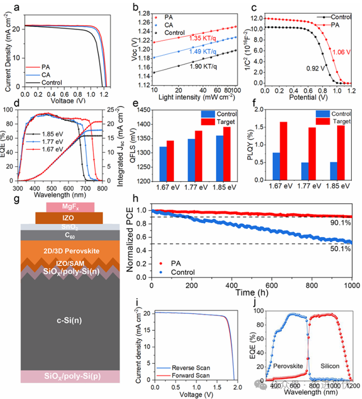 最佳单结宽带隙钙钛矿器件的效率从20.99%提升至23.16%,内建电势从0.92增至1.05 V;QFLS与PLQY在1.67-1.85 eV带隙范围内均显著提升;钙硅叠层电池器件效率达32.11%。光稳定性测试中PA改性器件在1000小时连续光照老化后保持90.1%初始效率,远超对照组(50.1%),证明2D钙钛矿通过结晶调控与相分离抑制实现钙硅叠层器件光电转换效率和长期稳定性的协同突破。