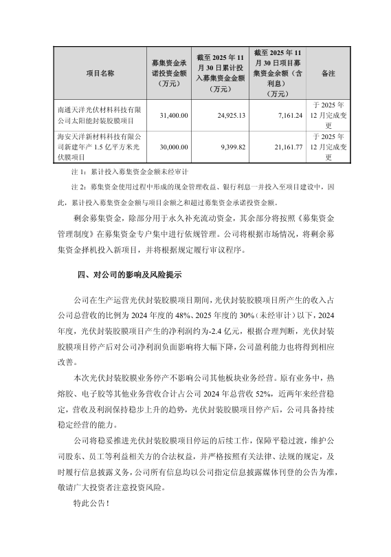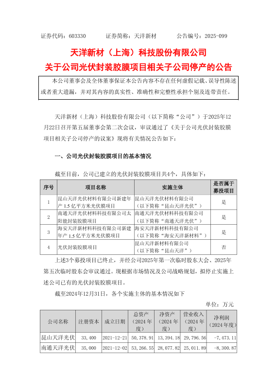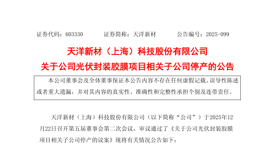 12月22日晚间,天洋新材(603330.SH)发布公告,宣布拟对光伏封装胶膜项目相关子公司全面停产。