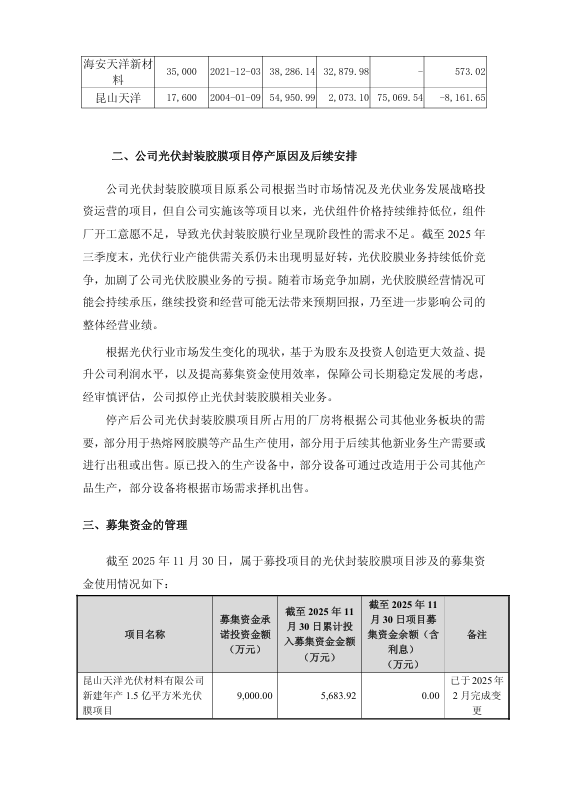 公告显示,此次停产决策源于光伏行业市场变化及公司经营考量。当前光伏组件价格持续低位运行,导致光伏封装胶膜行业需求阶段性不足,低价竞争加剧企业亏损。天洋新材自身胶膜业务表现疲软,2024年度该板块净利润亏损约2.4亿元,占当年总营收48%的核心业务反而成为业绩拖累;进入2025年,其营收占比已降至30%以下(未经审计),且除海安天洋新材料外,其余4个胶膜项目实施主体均处于亏损状态。