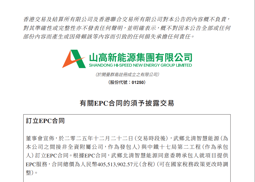 近日,山高新能源(01250.HK)发布公告,公司间接非全资附属公司武乡北清智慧能源于12月22日与中铁十七局第二工程签订EPC总承包合同,拟投资建设山西长治武乡县100兆瓦光伏发电项目,合同总价超4.05亿元(含税),标志着公司在山西省清洁能源市场的战略布局再进一步。