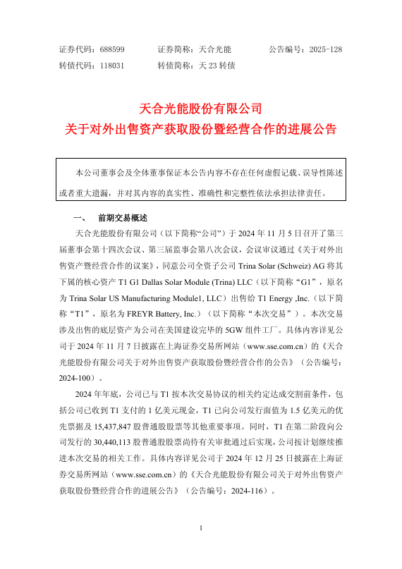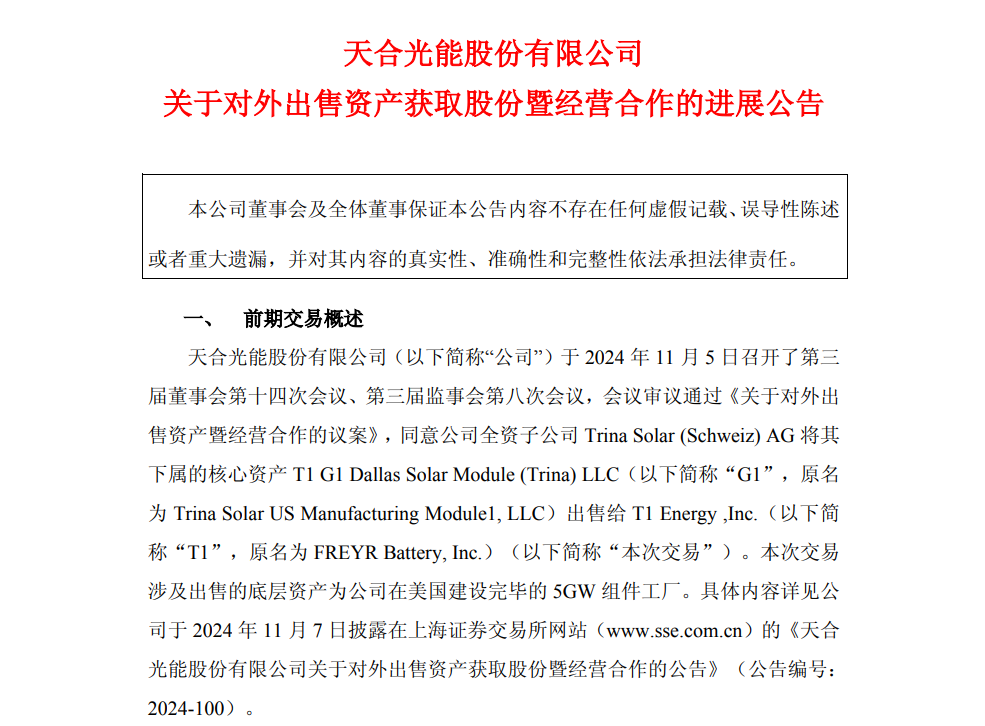 据悉,该项交易始于2024年11月,天合光能董事会同意全资子公司Trina Solar (Schweiz) AG将美国建成的5GW组件工厂出售给T1 Energy。交易分两阶段推进:2024年底第一阶段交割后,公司已收回1亿美元现金、1.5亿美元优先票据及首批1543.78万股T1 Energy普通股;2025年完成第二阶段交割,先后获得1252.17万股及剩余1791.85万股普通股,最终合计持股达4587.80万股,占T1 Energy截至12月18日总股本的17.4%。