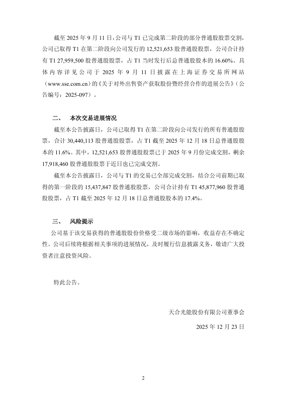 12月22日晚间,天合光能(688599.SH)发布公告称,公司与美国企业T1 Energy的跨境资产交易已完成全部股份交割,通过此次交易,天合光能以资产换股权的方式持有T1 Energy 17.4%股份,实现对北美市场的灵活深耕。