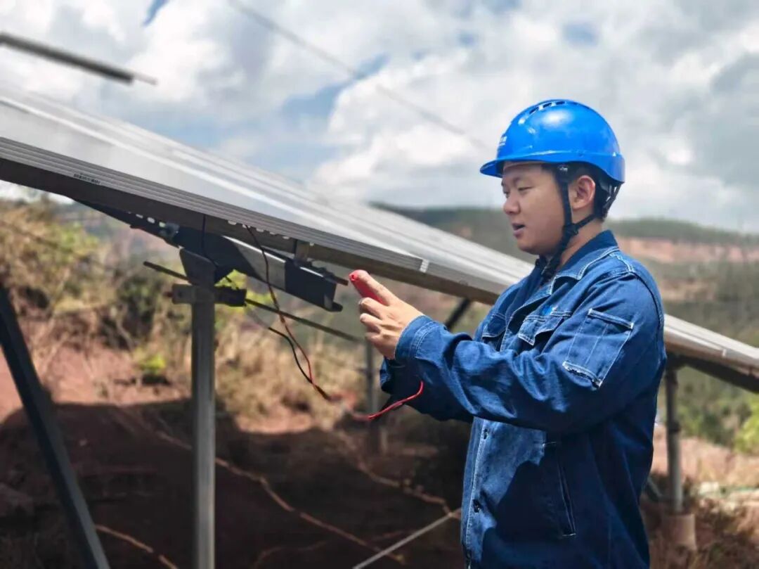 张达、杜华林、刘雷检查光伏板支架安装情况