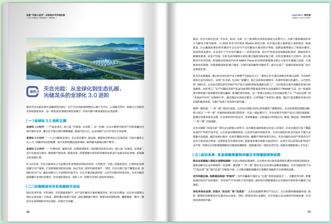 《报告》聚焦六大场景、调研十余个地方政府与企业出海实践,涵盖制造业、新能源、数字经济等多个领域。天合光能作为全球光储智慧能源的领先者,其全球化3.0进阶路径被收录于“企业实践——新能源:绿色全球化新范式”章节,成为新能源行业“走出去”到“走进去”的典型样本。
