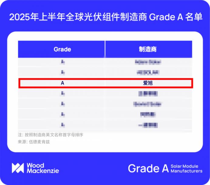 近日,伍德麦肯兹(Wood Mackenzie)发布2025年上半年"全球光伏组件制造商排名"最新报告。爱旭凭借在可靠性、创新性的卓越表现和全球光伏市场的影响力成功入选 “Grade A”光伏组件厂商名单,再次证明爱旭在全球光伏行业的领先地位。