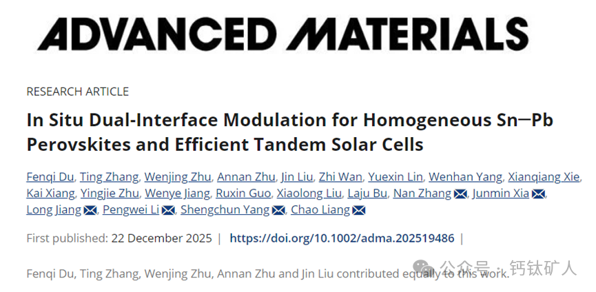 F. Du, T. Zhang, W. Zhu, A. Zhu, J. Liu, Z. Wan, Y. Lin, W. Yang, X. Xie, K. Xiang, Y. Zhu, W. Jiang, R. Guo, X. Liu, L. Bu, N. Zhang, J. Xia, L. Jiang, P. Li, S. Yang, C. Liang, In Situ Dual-Interface Modulation for Homogeneous Sn-Pb Perovskites and Efficient Tandem Solar Cells, Advanced Materials, 2025.DOI:10.1002/adma.202519486