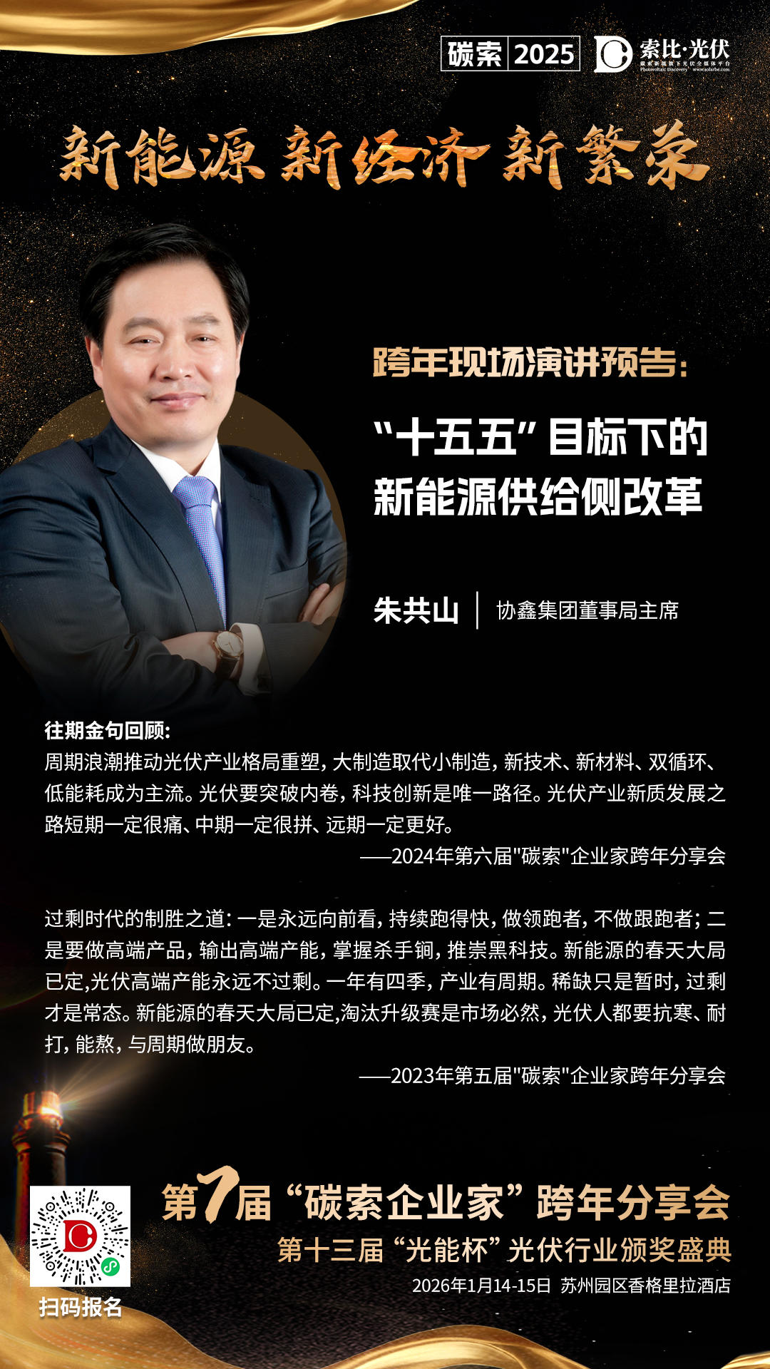 在此承前启后的重要时刻,2026年1月15日,第七届“碳索”企业家跨年分享会将于苏州园区香格里拉隆重召开。本次大会将汇聚众多光伏领域的企业家、创始人与行业领袖,共同前瞻趋势、共谋发展。尤为值得关注的是,协鑫集团董事局主席朱共山将亲临现场,并发表题为《“十五五”目标下的新能源供给侧改革》的重磅演讲。