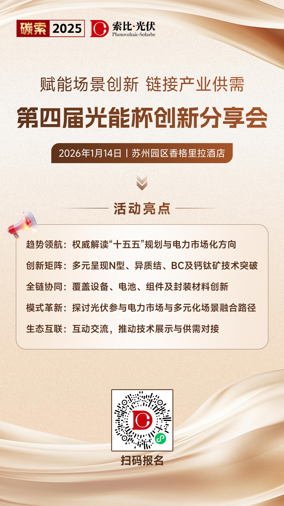 “赋能场景创新 链接产业供需”,为激发更多创新模式与思维火花,由中国能源研究会新能源智能制造与应用技术专委会、碳索新能主办,索比光伏网承办的第四届“光能杯”创新分享会将于2026年1月14日盛大启动!