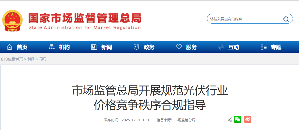 12月26日,国家市场监管总局在安徽合肥对光伏行业开展价格竞争秩序合规指导,通报光伏行业价格违法问题和风险,参与部门包括国家发展改革委、工业和信息化部、商务部相关司局同志,江苏、浙江、安徽、青海等地市场监管部门同志,以及发电集团等。